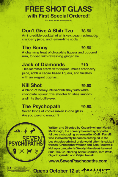 After a long 3 weeks, Seven Psychopaths (2012) finally came to Canton, NY. This is a movie that I’d been waiting to see for a few months now. If you need some reasons to see it, consider these: Sam Rockwell, Christopher Walken, Colin Farell, and Woody Harrelson. Regardless of whether or not I was going to review this movie, I knew I was going to see it. I just really had to hope that there would be some sort of alcohol in it so I could make a relevant drink. Lucky for me, it turns out that Colin Farell’s character Marty being an alcoholic is a major plot point. Woohoo!