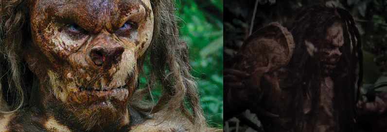 Pictured above is the creature from The Forgotten Ones (left) and The Lost Tribe (right). There is improvement in creature design, but it’s unfortunately towards the Predator side of things. However, my real issue is that these creatures don’t…really look like the missing humanoid link. It improves from TFO to TLT, but barely. These creatures also lack the ability to rip hearts out of chests (completely crackings sternums) but they do it anyways.