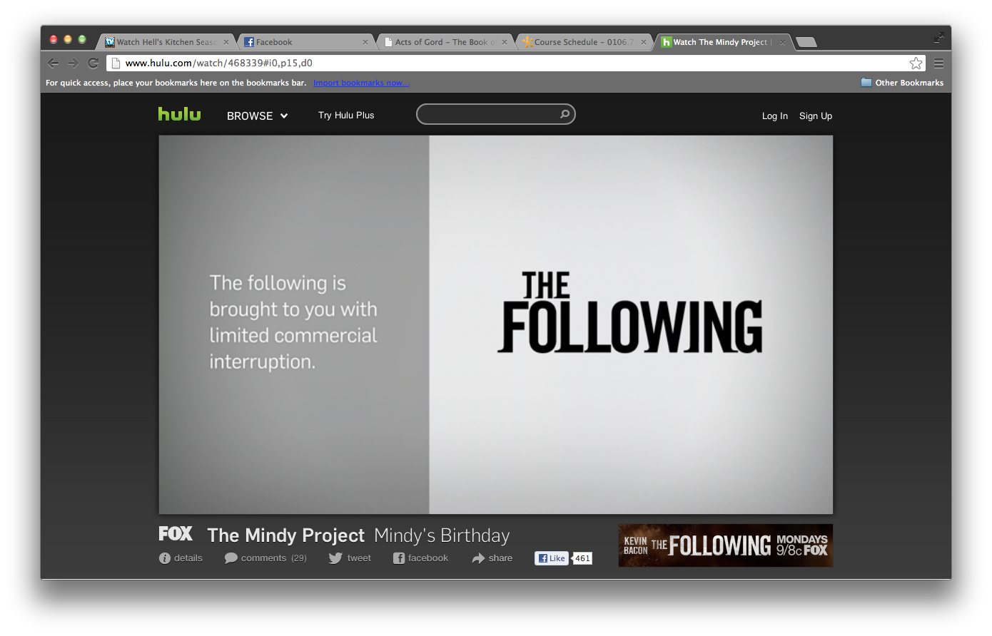 First of all this week, this. It is my most favorite thing in the WORLD when this happens. “The following…by the Following.” YES. Someone made an announcer say this. And yes, I was watching The Mindy Project. I like it. It’s funny.