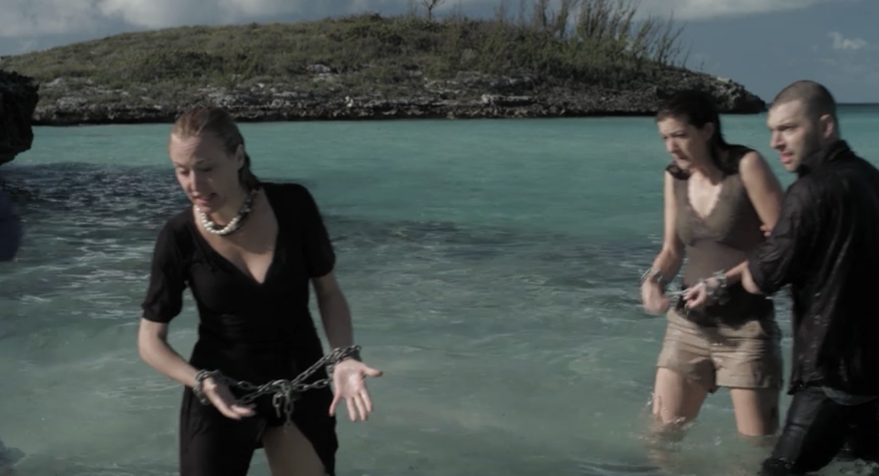 Okay, so here’s the spiel. This madman plays a game with his guests. ‘You are wearing shackles. I throw a key into a pool. You get the key, you release yourself, you surface before 15 seconds are up, you live. If not, I release the shark.’ All of the kidnap-ees are terrified of this before it is explained to them. Actually, their challenge is more complicated. Shark obstacle course, GO.