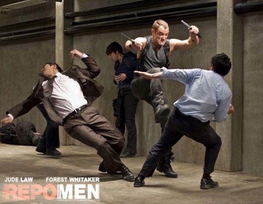 Repo Men opens with Jude Law establishing himself as a care-for-nothing baddie in an apocalyptic wasteland in the not-so-distant future and the Schrödinger paradox. Jude Law looks like a Jehovah’s Witness (instead of a terrifying gas-masked villain) and he wields a civil taser and release form.