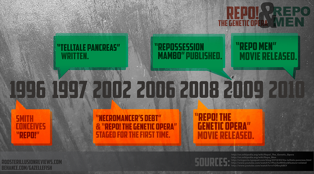 Naturally, as a huge fan of Repo! The Genetic Opera, I wanted to know where things went wrong, which is when we learn that Repo Men isn’t a remake. I made an infographic to help explain everything because the timeline is weird and kindaaaaa sketchy. I did legitimate research for this you guys. I have sources and everything. Here is the timeline.