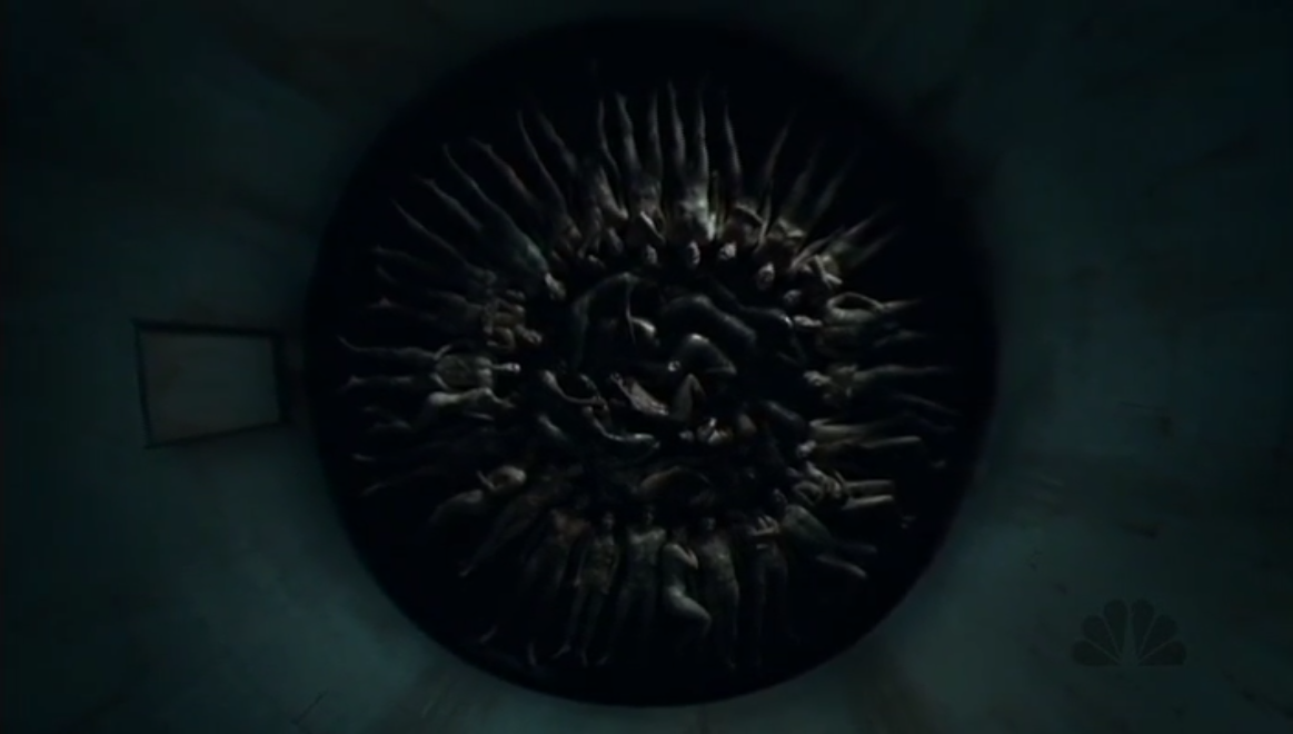 As usual, the killer-of-the-week is the least interesting part of the episode. I’m invested in the characters, not the gore. The new serial killer abducts his victims Buffalo Bill-style (from what I remember of The Silence of the Lambs), then fills them with heroin and silicone and coats them in resin. He’s making human models. So far, the Feds just have his discard pile, and are left wondering how many other victims he has. We find out at the end of the episode. It’s a whole bunch, placed carefully inside of an empty grain silo to form the shape on an eye.