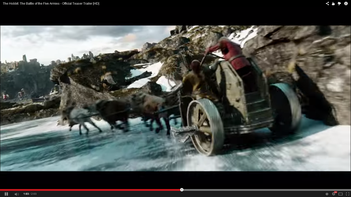 Here we see a few of the dwarves skidding along ice on some kind of goat-drawn chariot, about to face some hungry wolves (oh no!). I can’t really imagine why this in here, but it looks really fake and unnecessary. The goats are an interesting choice as well, exhibited in another section of the trailer as well. I don’t know how well you’re remembering, but in The Lord of the Rings, the bad guys rode on wargs, horses, fell beasts, and mumakil. The good guys rode on horses and eagles. Clearly a little uncomfortable with this unbalanced ratio, Jackson has added, in addition to horses and eagles, not only elks for the elves, but now goats for the dwarves, because why the hell not?