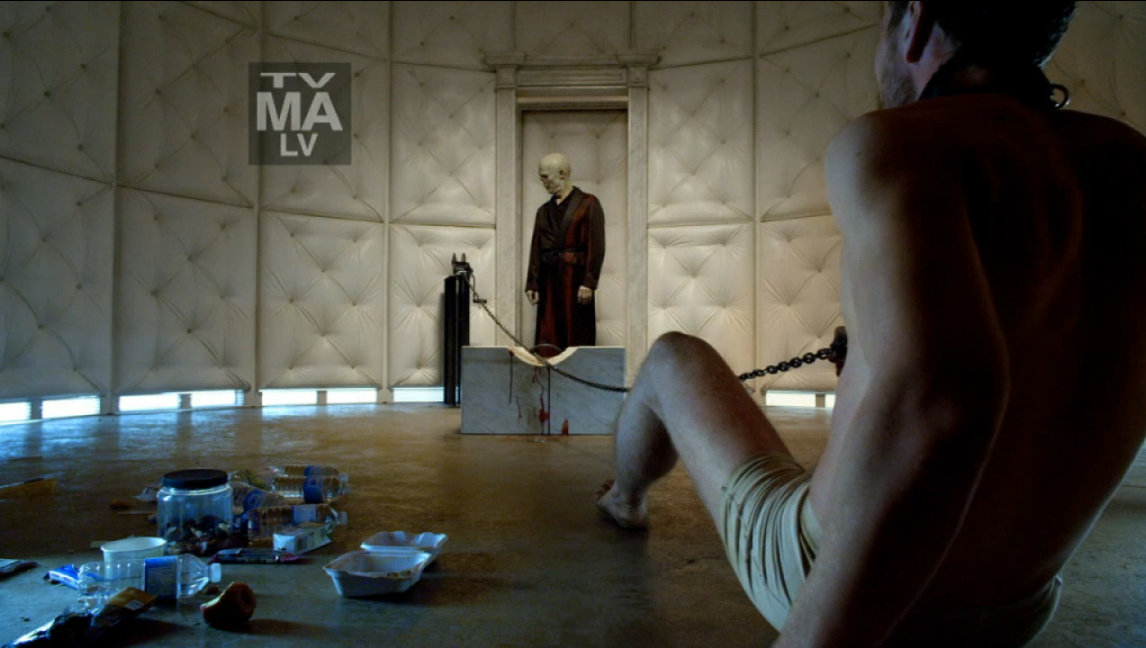 One of my big critiques is that the show feels very clunky for a del Toro-inspired work, who is normally the kind of person to inject art into every shot. I was somewhat rewarded for my patience this week in the below shot, featuring a close up on a padded door that definitely evokes a coffin before panning out to the wider shot seen here. This shot, as you might imagine from the disturbing sense of what’s going on, is actually a fantastically creepy scene. We are immediately transported to Eph’s wife’s house for some good old Eph-hunting, as the CDC/government is tracking him down. That scene ends with clunky dialogue, as The Strain is wont to do.