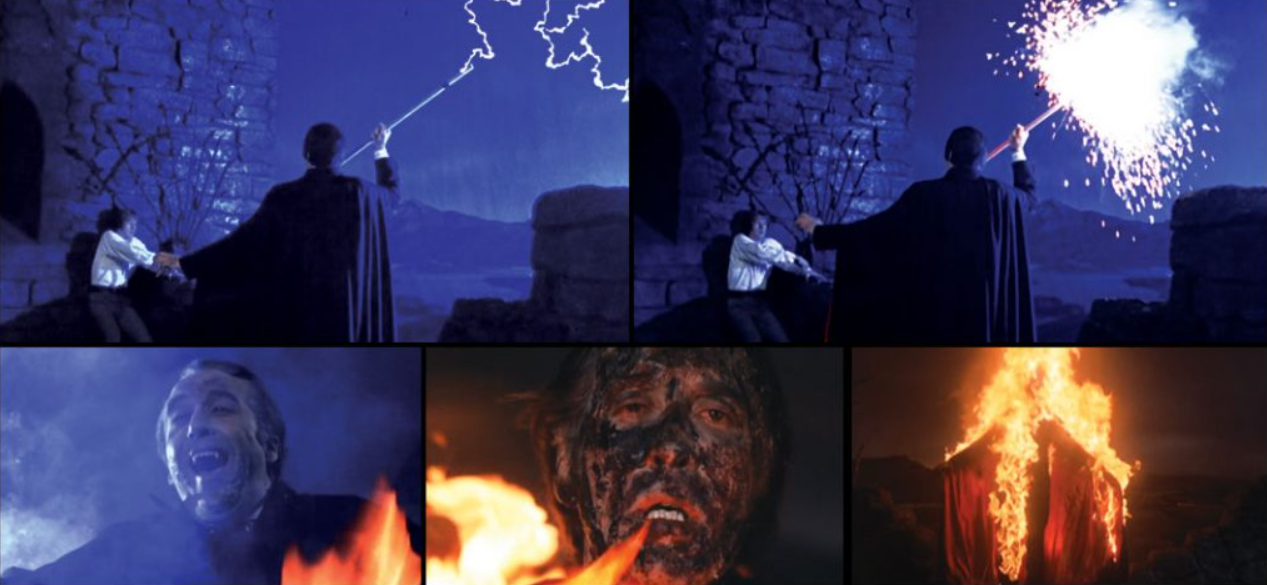 Killer: Act of God/freak lightning strike. The lightning hits the metal conductor, setting Dracula on fire. Burning to ashes, his corpse falls from the parapet a hundred feet onto sharp rocks.
