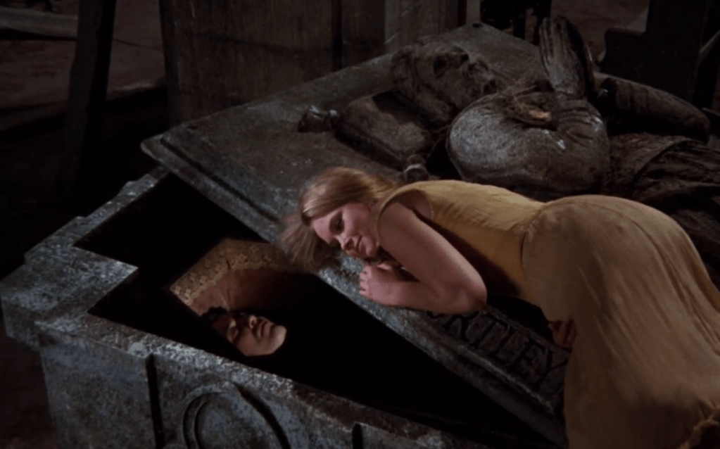 From here things get pretty fun and the plot tosses in a few unexpected twists. Dracula enthralls the gentlemen’s children to do his dirty work for him. The main focus lands on Alice, played by Linda Hayden, whom I’d previously seen in The Blood on Satan’s Claw and the Vincent Price/Peter Cushing-starrer Madhouse. I’ve never seen her outside of the context of ’70s British horror, and that’s totally okay. She clearly had a ton of fun with it, lending a lot more to the role of “vampirized blonde damsel” than the other actresses in this series.