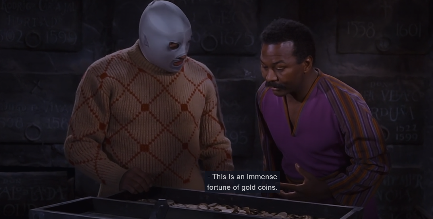 El Santo starred in well over 50 movies and I’ve seen a good handful of them. This is the first one that, honestly, I felt a little underwhelmed by. Maybe I set my sights too high with “Mexican wrestler”, “time machine”, and “Dracula’s treasure”. While the screenplay itself has a lot of unintentional gems—about as many as you’d expect from a movie where a vampire-fighting luchador is widely regarded as the world’s preeminent authority on time travel—it also made a few head-scratching blunders. The biggest of these, of course, and the most unforgivable, is the fact that El Santo himself never actually travels back through time. The first half an hour or so unfolds as a by-the-numbers Dracula fest as Santo twiddles his thumbs in the present day. Once his time traveler returns to the present, they set out to locate the vampire’s tomb and treasure, both of which are conveniently nearby. We’re a good 45 minutes into the movie before our first wrestling occurs. Call me old fashioned, but that’s too long to wait.